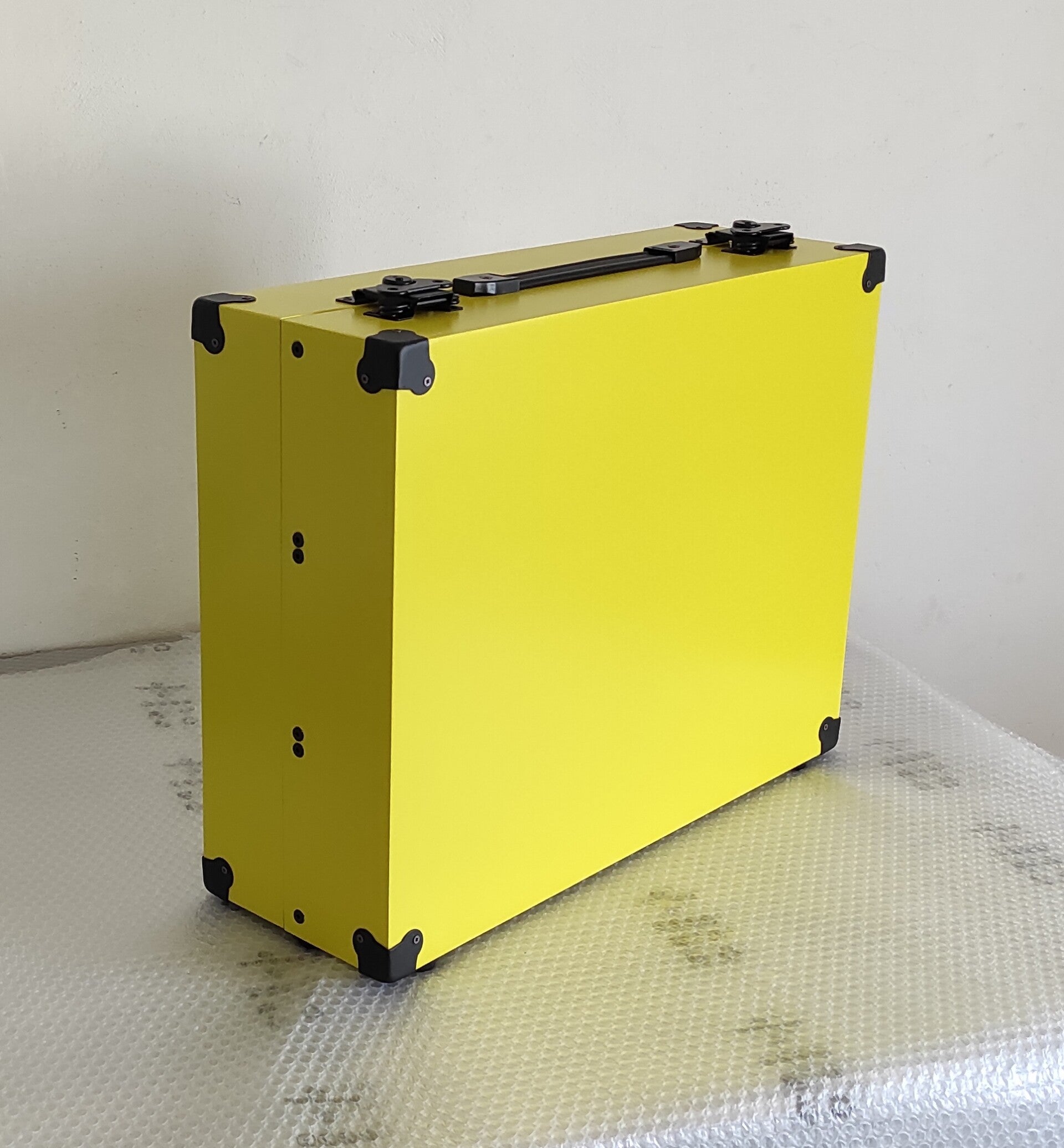 Eurorack 9U 104 hp suitcase case, lockable and patched. The standard version comes with: 2 Meanwell RT 65 B PSU, 2 x 20-socket busboard (total of 40 sokets ) from nano modules , sliding nuts. Dimensions, number and type of PSUs, number of busboards, and the addition of threaded strips are all possible modifications upon request.