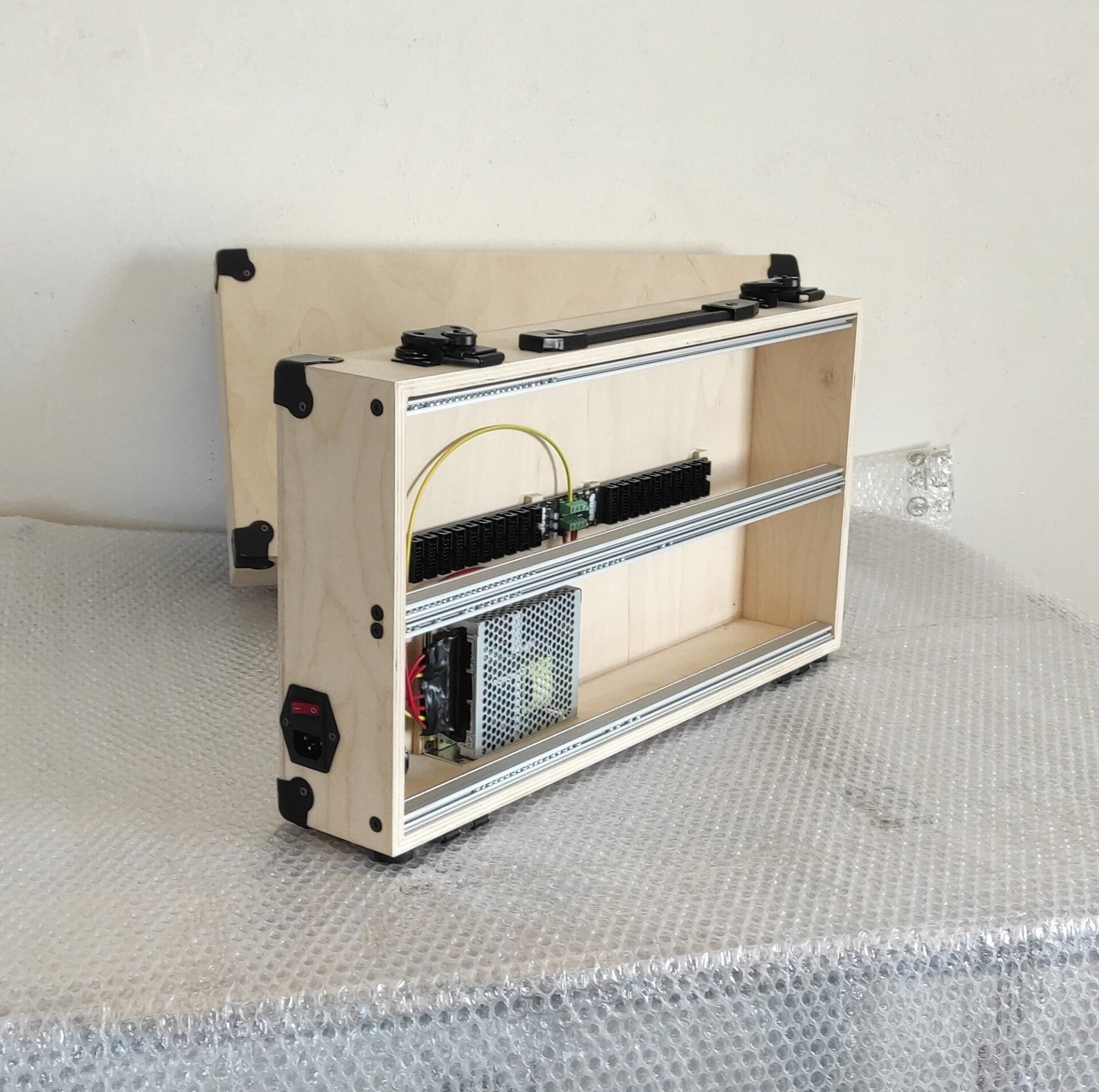 Eurorack 6U 104 hp suitcase case, lockable and patched. The standard version comes with: 1 Meanwell RT 65 B PSU, 1 20-socket busboard from Nano Modules, sliding nuts. Dimensions, number and type of PSUs, number of busboards, and the addition of threaded strips are all available upon request.