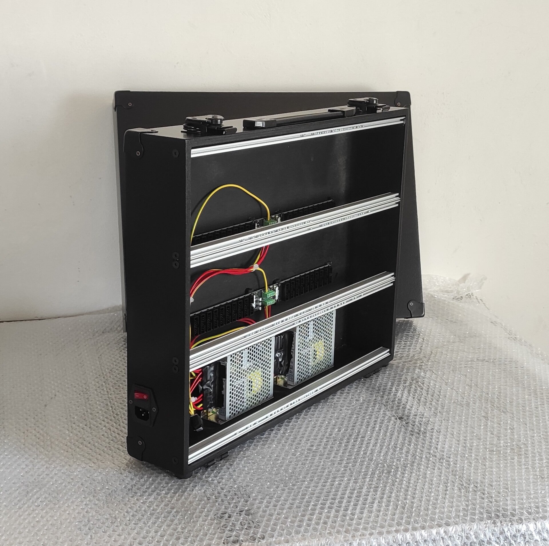 Eurorack 9U 104 hp suitcase case, lockable and patched. The standard version comes with: 2 Meanwell RT 65 B PSU, 2 x 20-socket busboard (total of 40 sokets ) from nano modules , sliding nuts. Dimensions, number and type of PSUs, number of busboards, and the addition of threaded strips are all possible modifications upon request.