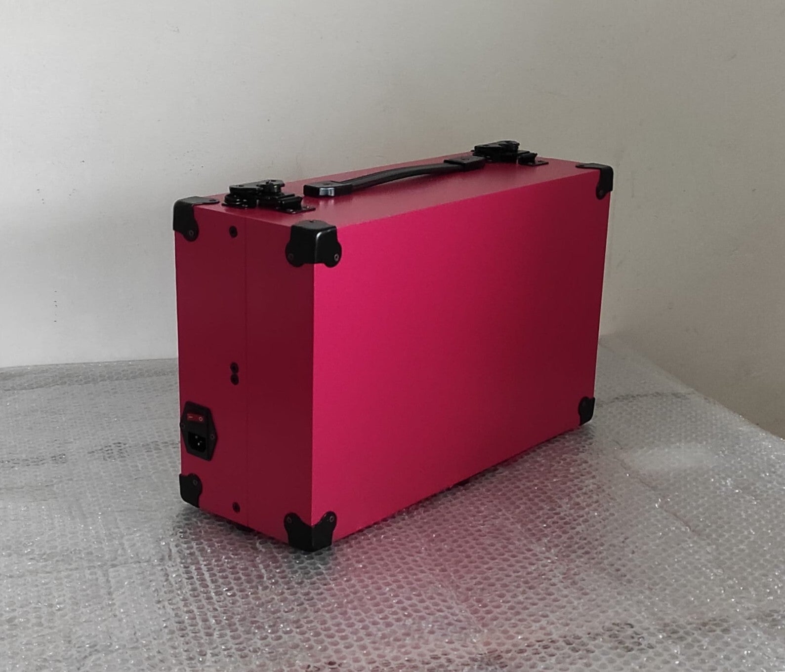 Eurorack 6U 88 hp suitcase case, lockable patched. The standard version comes with: 1 Meanwell RT 65 B PSU 1 20-socket busboard (nano modules), sliding nuts. Dimensions, number and type of PSUs, number of busboards, and the addition of threaded strips are all possible modifications upon request.