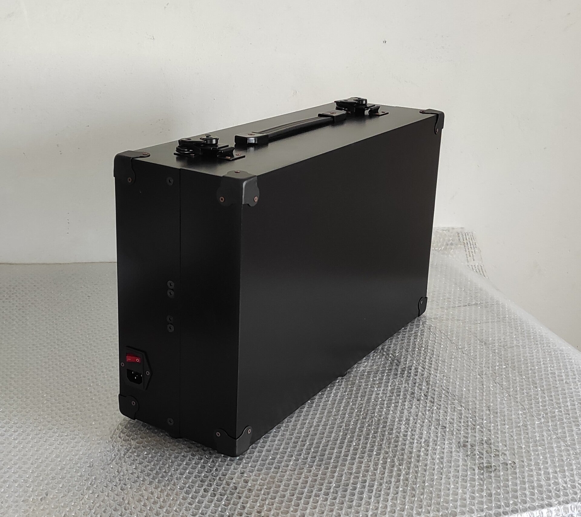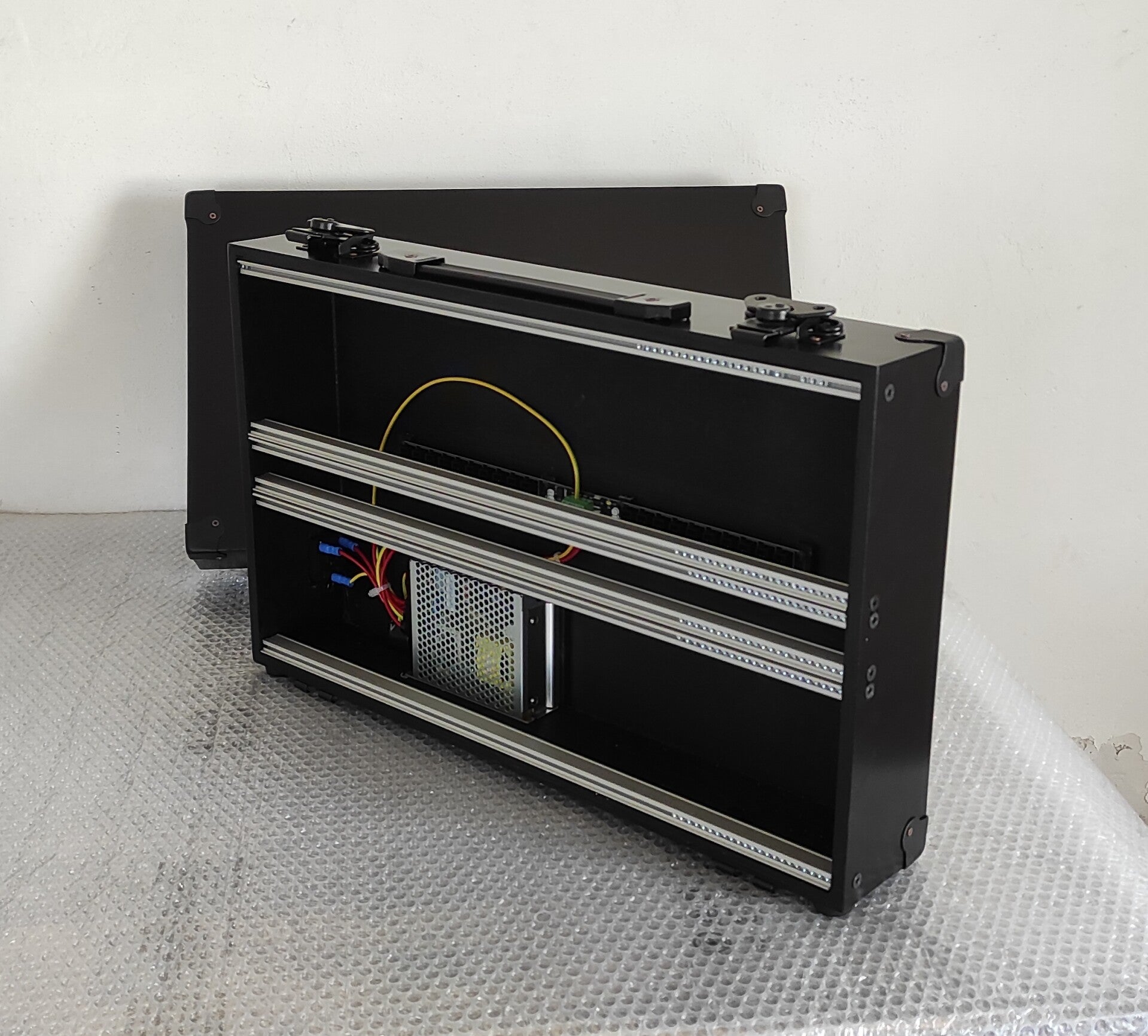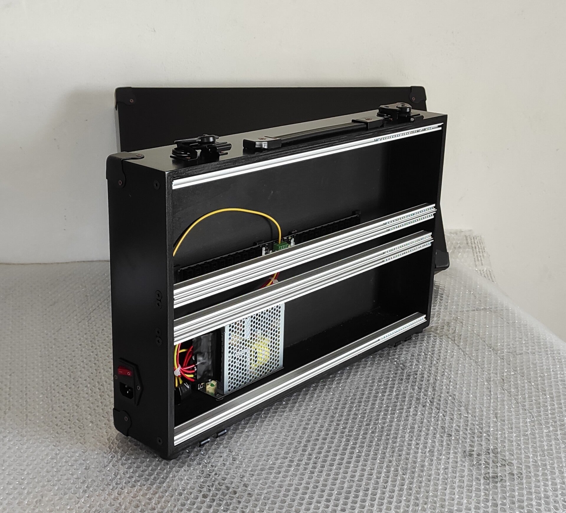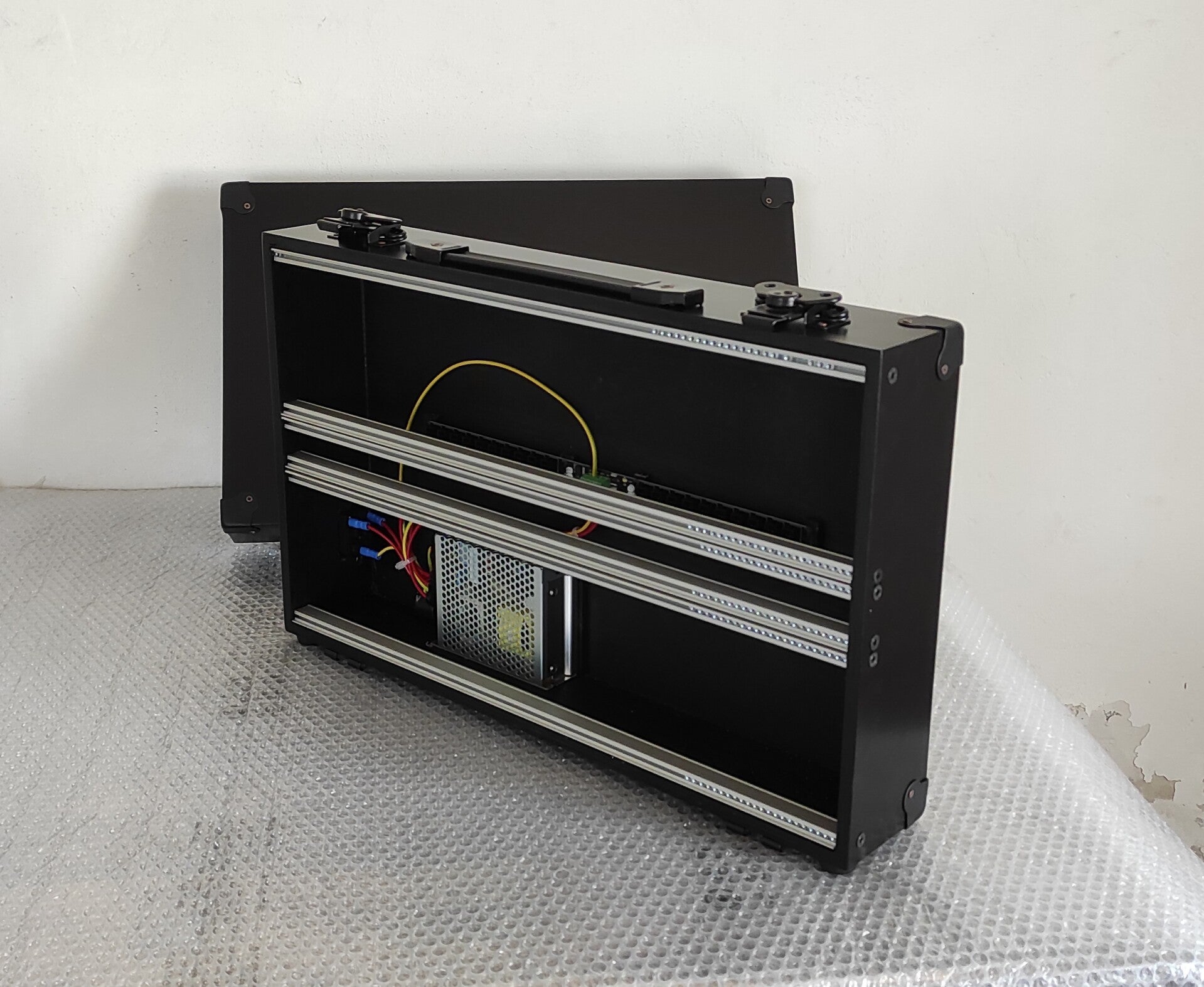 Eurorack 7U 104 hp suitcase case, lockable and patched. The standard version comes with: 1 Meanwell RT 65 B PSU, 1 x 20-socket busboard (total of 20 sokets ) from nano modules , sliding nuts. Dimensions, number and type of PSUs, number of busboards, and the addition of threaded strips are all possible modifications upon request.